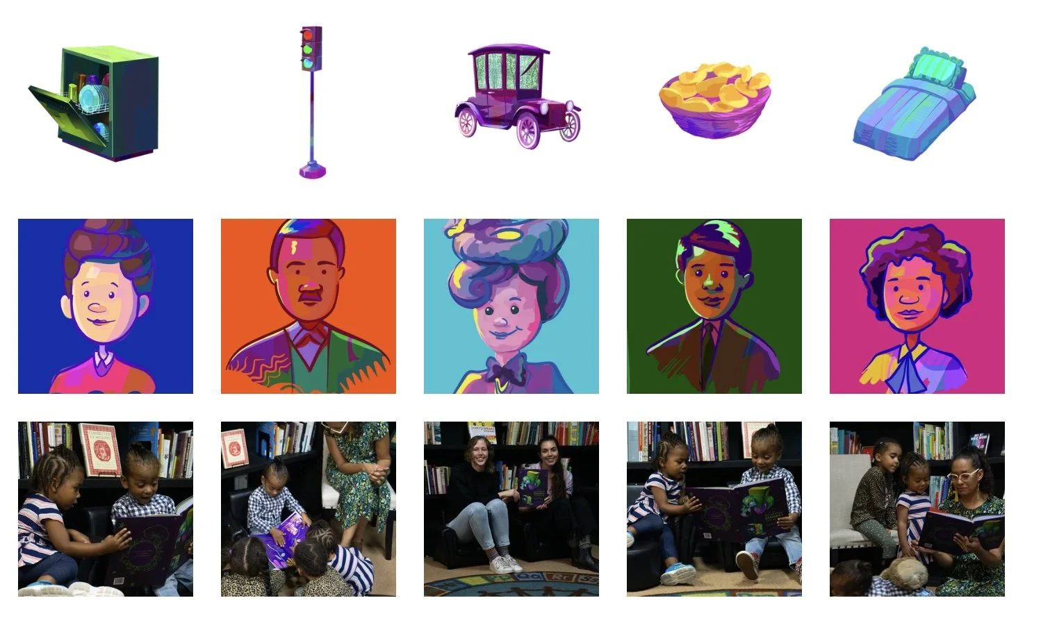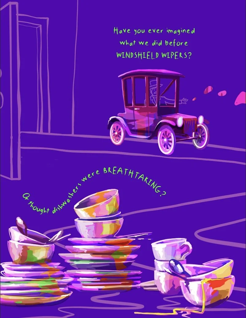 I selected five inventions that would resonate with children's lived experience and crafted each story to balance biographical detail with accessible explanation of the invention's impact. I chose a whimsical, Dr. Seuss-inspired writing style, playful rhythm, inventive language, and rhyme, to make the stories engaging and memorable while tackling serious ideas about design and agency. The writing needed to inspire wonder about ordinary things while communicating a bigger message: our environment is shaped by conscious design choices, which means we have agency to alter our realities. Each inventor's story demonstrated problem-solving, creativity, and persistence, showing children that invention isn't magic reserved for geniuses but thoughtful response to real needs. Working with illustrator Kate McMillan, we created a visual-narrative rhythm that made complex ideas digestible while celebrating each inventor's unique perspective, with the whimsical prose style helping transform biographical facts into joyful, accessible storytelling.