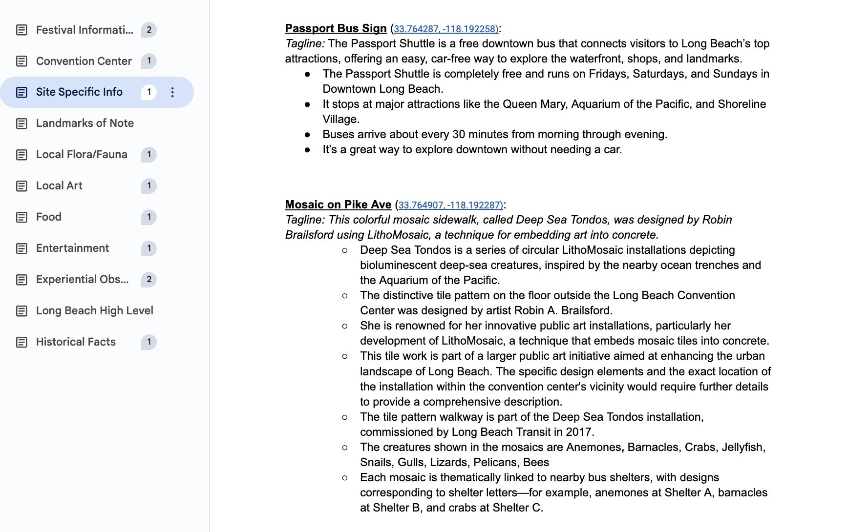 Working within a defined radius around the Long Beach Convention Center, I built a comprehensive knowledge base enabling Peridot to respond authentically to surroundings. I visited the site and photographed everything potentially visible, focusing on commonly overlooked ground-level details like mosaic tiles, architectural features, and environmental textures. Using reverse image search and interviews with Long Beach historians and artists, I compiled entries across categories: Site-Specific Info, Food, Entertainment, Festival Information, Convention Center, Landmarks, Local Art, Flora/Fauna, Historical Facts, and Experiential Observations (sensory details like "salty breeze," "jacaranda petals drifting").