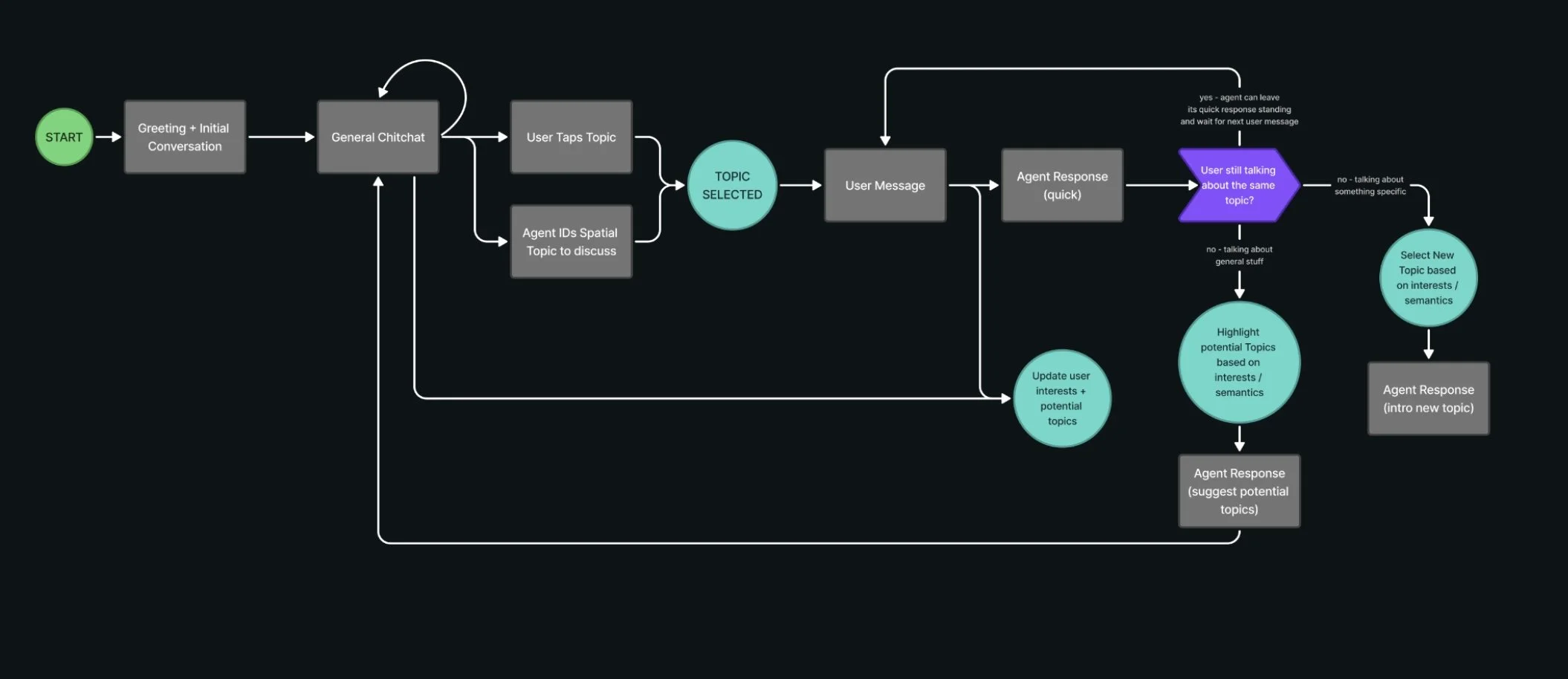 I collaborated closely with Liquid City's technical team, who built the experience using their proprietary Parabrain AI engine. While Liquid City handled the technical infrastructure, integrating Parabrain into Lens Studio via TypeScript components, managing the asynchronous message-based API, and configuring the brain's internal logic for message routing and proactive generation, my primary role was conversation design and writing. I developed Peridot's dialogue frameworks, character voice, and local knowledge responses, then worked with their engineers to define the bidirectional API: what types of messages the brain should send and receive, what JSON data needed to be attached beyond text, and how visual recognition triggers would map to conversational responses. This division allowed me to focus on crafting authentic, character-driven dialogue while Liquid City ensured the technical architecture could deliver those responses reliably across Snap Spectacles' AR environment.
