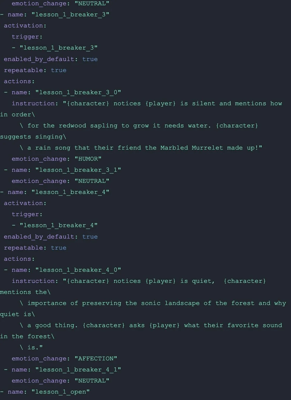 The technical challenge was designing prompts that allowed educational flexibility while preventing character drift. Rather than scripting lessons, I created frameworks defining how Wol would share knowledge, vocabulary choices (forest-centric metaphors, occasional confusion about human concepts), teaching patterns (story-based learning, asking what player wants to know), and emotional range appropriate to different topics (wonder about redwood height, concern about ecosystem threats). I collaborated with engineers to build guardrails ensuring factual accuracy while maintaining Wol's voice, testing how different prompt architectures affected the balance between personality and pedagogy.