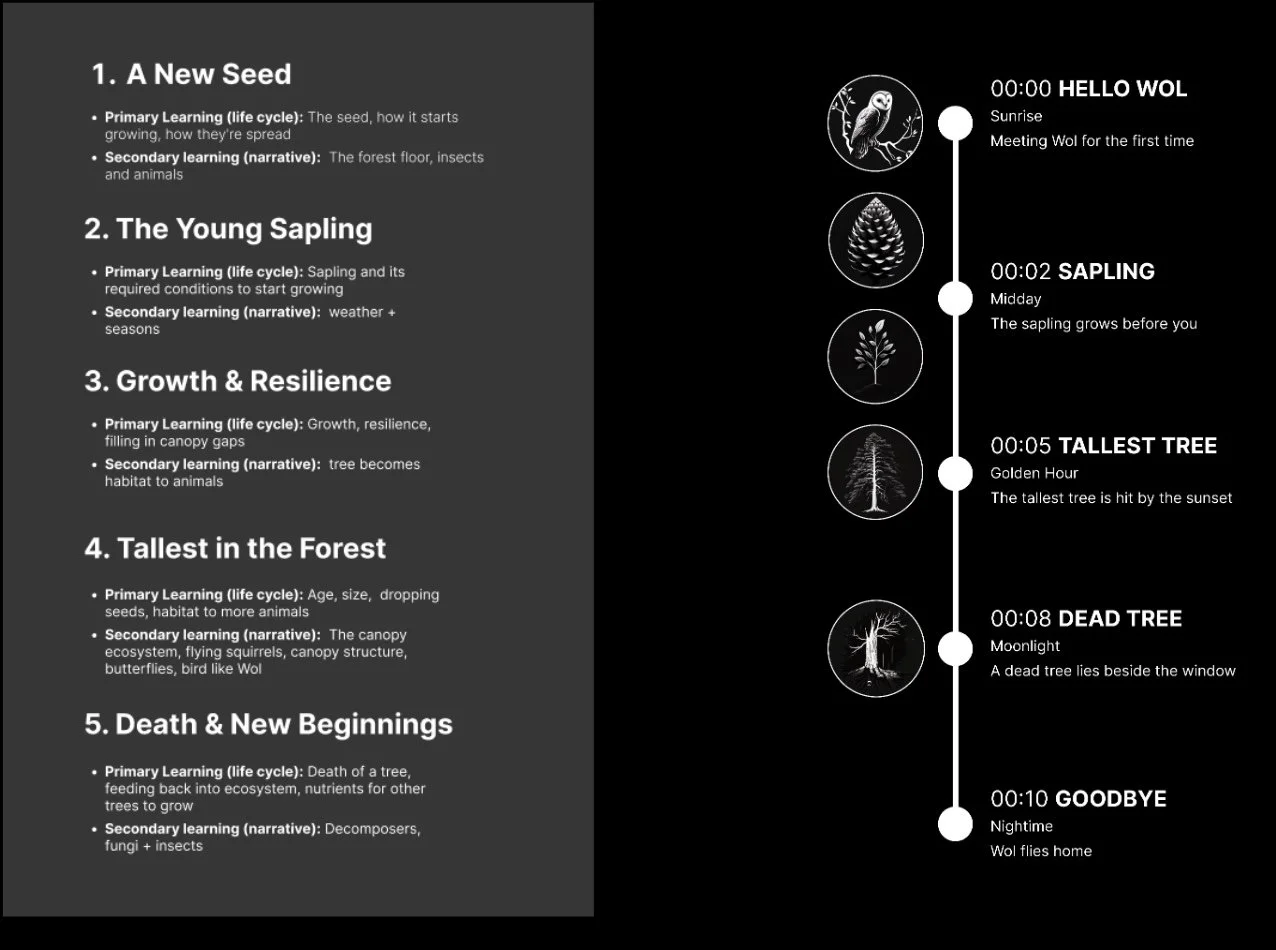 The Wol experience organizes forest ecosystem knowledge around the lifecycle of a redwood tree, creating a narrative arc that mirrors a single day from sunrise to nighttime. The curriculum progresses through five stages: A New Seed, The Young Sapling, Growth & Resilience, Tallest in the Forest, and Death & New Beginnings, each combining primary learning objectives (lifecycle concepts: germination, growth conditions, resilience, maturity, decomposition) with secondary learning through narrative exploration (forest floor biodiversity, seasonal changes, canopy ecosystems, species interdependence, decomposers).